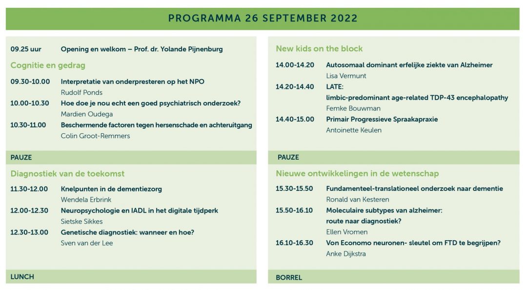 Vervolgens illustreren we aan de hand van knelpunten in de dementiezorg, nieuwe ontwikkelingen op het gebied van digitale meetmethoden en de klinische genetica, hoe optimale zorg en diagnostiek van dementie er in de nabije toekomst uit kunnen zien. Nauw daarmee verbonden bespreken we de klinisch relevante kenmerken en wetenschappelijke ontwikkelingen op het gebied van de autosomaal dominante Alzheimer. Wat zijn de gevolgen van TDP-43 in de hippocampus (LATE) en waarom is het van belang een primair progressieve spraak-apraxie te onderscheiden?