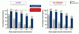 De SURMOUNT-4-studieresultaten die tijdens EASD 2023 zijn gepresenteerd, laten zien dat 55-57% van de deelnemers met overgewicht ≥ 25% afvalt met de duale GIP/GLP-1-receptoragonist tirzepatide. De studie bereikte het primaire eindpunt van superieure verandering in lichaamsgewicht in vergelijking met placebo vanaf de eerste fase van de studie (36 weken) tot 88 weken. Dit wijst op aanhoudend gewichtsverlies.