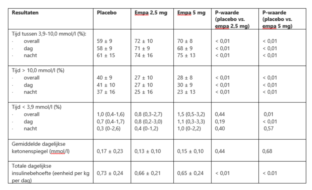 Met empagliflozine 2,5 mg nam de tijd die patiënten doorbrachten met een waarde < 3,9 mmol/l niet toe; met empagliflozine 5 mg was dat wel het geval (p = 0,01). De gemiddelde ketonenspiegels verschilden niet (p = ns). Ook waren er geen ernstige bijwerkingen.