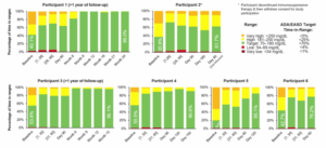 Ook patiënt 3 uit het tweede deel die de volledige streefdosis VX-880 kreeg, is insulineonafhankelijk. Deze patiënt had 19 jaar diabetes en gebruikte 45,1 eenheden insuline per dag, met een HbA1c van 60 mmol/mol en een TIR van 53,8% op baseline. Deze patiënt werd insulineonafhankelijk op dag 180 en is dat nog steeds na 12 maanden (HbA1c 42 mmol/mol, 96,8% TIR).