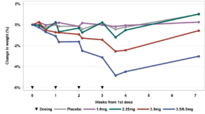 De dosis-responsrelatie werd aangetoond voor plasmaglucose, insuline, triglyceriden en maaglediging na een gemengde maaltijdtest. Het gemiddelde gewichtsverlies was 0,1, 0,5, 2,4 en 4,5% na 4 weken behandeling in elk cohort (figuur 2).