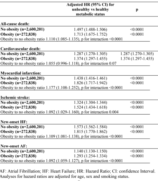Vijf jaar lang zijn bijna 3 miljoen Franse ziekenhuispatiënten van 18 jaar en ouder gevolgd. Ongeveer 2,9 miljoen volwassenen (van wie 272.838 [9,5%] met obesitas) die geen ernstige cardiovasculaire gebeurtenis hadden doorgemaakt, zijn onderverdeeld op basis van hun BMI en metabole gezondheid. Mensen die geen hypertensie, geen hoog cholesterol of andere vetten in het bloed hadden en geen diabetes, werden geclassificeerd als ‘metabool gezonde obesitas’. Toch blijken deze mensen een 22% hoger risico te hebben op een belangrijke cardiovasculaire gebeurtenis (MACE, HR 1,22, 95%-BI 1,19-1,24) dan mensen met een normaal gewicht zonder metabole afwijkingen. Ze hadden een 34% hoger risico op het ontwikkelen van hartfalen (HR 1,34, 95%-BI 1,31-1,37) en 33% meer risico op het ontwikkelen van atriumfibrilleren (HR 1,33, 95%-BI 1,30-1,37). Daarentegen waren de risico’s niet hoger voor myocardinfarct (HR 0,92, 95%-BI 0,87-0,98), ischemische beroerte (HR 0,93, 95%-BI 0,88-0,98) en cardiovasculaire sterfte (HR 0,99, 95%-BI 0,93-1,04).