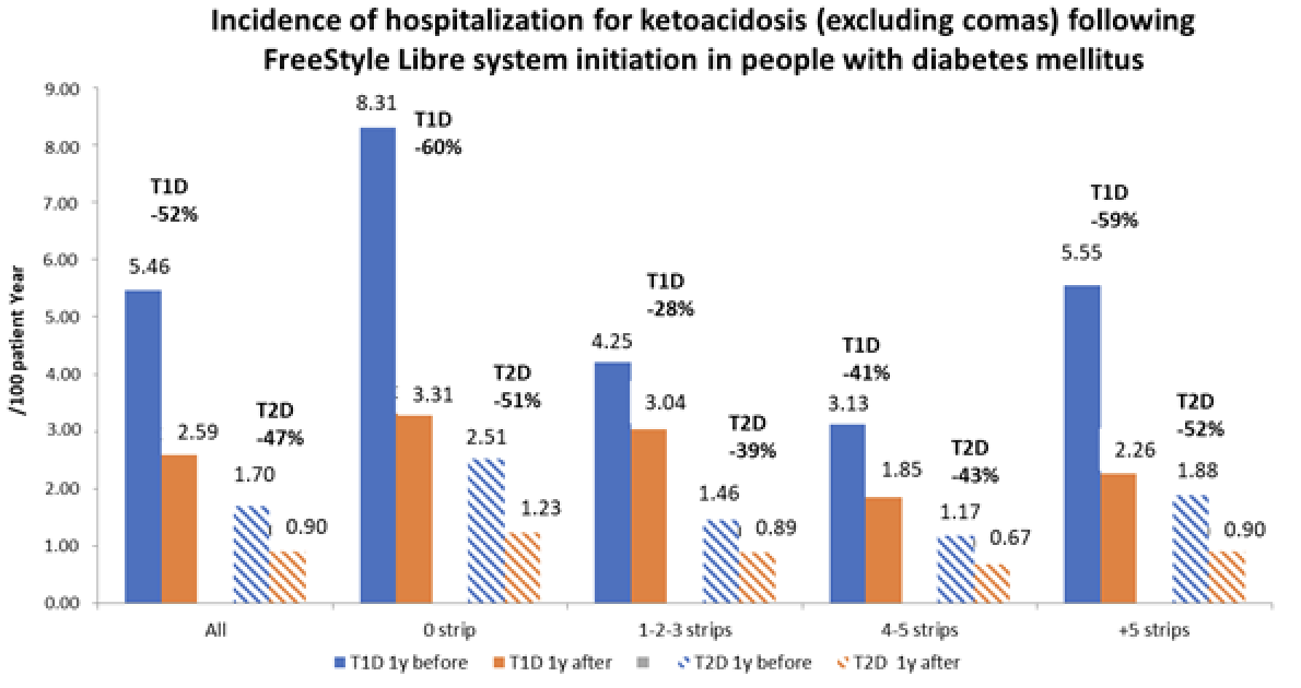 Roussel R, et al. Dramatic drop in ketoacidosis rate after FreeStyle Libre system initiation in type 1 and type 2 diabetes in France, especially in people with low Self-Monitoring of Blood Glucose (SMBG): a nationwide study. 80th ADA Virtual Scientific Sessions.