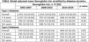 SEARCH for Diabetes in Youth (SEARCH) is de grootste studie naar jongeren met diabetes in de VS. In een van de onderzoeken is gekeken naar trends in de glykemische controle van 6492 deelnemers. Zij zijn ingedeeld op basis van diabetesduur (1-4, 5-9 en > 10 jaar) en leeftijd (10-14, 15-19, 20-24 en 25 jaar). Verder is onderscheid gemaakt in drie tijdsperioden: 2002-2007, 2008-2013 en 2014-2019.