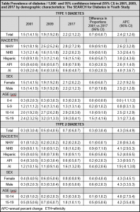 In SEARCH is ook gekeken naar de prevalentie. Van 2001 tot 2017 steeg de prevalentie van 1,5 naar 2,2/1000 voor T1D en van 0,3 naar 0,7/1000 voor T2D. De toename van T1D en T2D was significant (p < 0,05) voor alle etnische groepen. Terwijl de prevalentie van T1D hoger is bij jongeren en jongvolwassenen dan T2D, is de APC bijna het dubbele voor T2D.