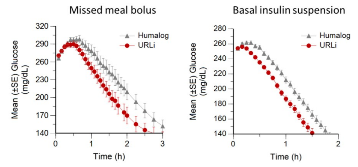 In een dubbelblinde, gerandomiseerde studie met 32 type 1-diabetespatiënten die een insulinepomp gebruikten (CSII), bleken hyperglykemieën (plasmaglucose > 13,3 mmol/l) met URLi sneller te stabiliseren dan met insuline lispro. Na een vergeten maaltijdbolus daalde de bloedglucose met een correctiebolus met URLi 23 minuten sneller (p = 0,1) tot 7,8 mmol/l dan met insuline lispro. Bij niet-toegediende basaalinsuline daalde de bloedglucose met een correctiebolus 16 minuten eerder (p = 0,001) dan met insuline lispro.
