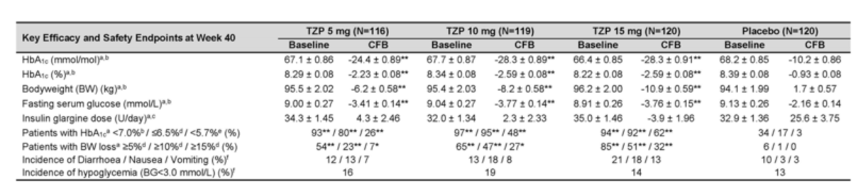 Alle drie de doses tirzepatide waren superieur aan placebo wat betreft de veranderingen in HbA1c, FSG, lichaamsgewicht en het percentage patiënten dat de streefwaarden voor HbA1c en lichaamsgewicht bereikte in week 40. De verlaging in HbA1c was voor alle groepen statistisch significant (p < 0,001, alle doses):