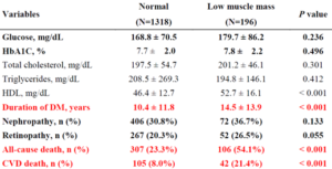 Een vervolganalyse toonde aan dat een lage spiermassa ongeacht HbA1c en microvasculaire complicaties verband hield met overlijden door alle oorzaken en cardiovasculair overlijden.