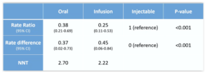 Het belangrijkste verschil tussen de groepen op baseline was, dat de groep die naar een infusietherapie switchte, daaraan voorafgaand vaker (in 67% van de gevallen) nieuwe MRI-laesies had.