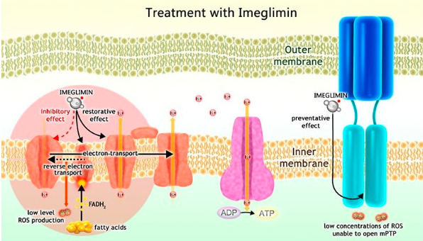 Het doel van imeglimine is de progressie van diabetes type 2 te vertragen en het risico op complicaties te verkleinen. Prof. Ralph DeFronzo (Universiteit van Texas), ging tijdens de sessie in op de rol die mitochondriën spelen in de ontwikkeling van deze vorm van diabetes. Door het aantal mitochondriën te verhogen, wordt afsterven van cellen (cytochrome C release) voorkomen en worden bètacellen bij oxidatieve stress beschermd bij hoge glucosewaarden. Daarnaast voorkomt imeglimine endotheeldisfunctie, wat een positief effect kan hebben op atherosclerose en cardiovasculaire complicaties. Ook beschermt imeglimine de bètacelmassa en -functie over langere tijd, waardoor de progressie van diabetes zal vertragen. DeFronzo noemt het een uniek werkingsmechanismen dat door het effect op de lever ook mogelijkheden kan bieden bij patiënten met leveraandoeningen als NASH.