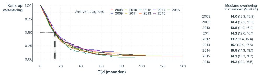 TNBC heeft een slechte prognose. De vijfjaarsoverlevingskans van patiënten met TNBC is laag. Slechts 11% van de patiënten met een gemetastaseerde ziekte is vijf jaar later nog in leven.1 De mediane overleving voor gevorderde TNBC is in de afgelopen tien jaar helaas nauwelijks verbeterd en varieert van 13-15 maanden (figuur 1).1