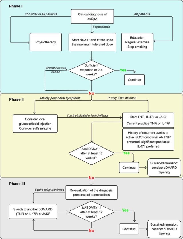 1. Ramiro S, Nikiphorou E, Sepriano A, et al. ASAS-EULAR recommendations for the management of axial spondyloarthritis: 2022 update. Ann Rheum Dis. 2022 Oct 21;ard-2022-223296.  doi: 10.1136/ard-2022-223296.