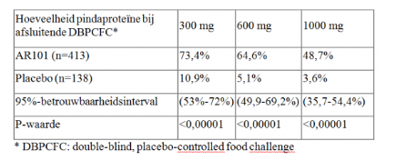 In de actieve behandelgroep en de placebogroep had resp. 97% en 94% minstens 1 tijdens de behandeling opkomende bijwerking, meest licht of hooguit matig ernstig, nooit levensbedreigend. De studie werd afgemaakt door 442 deelnemers (80%), in de AR101-groep 76% en in de placebogroep 92%. Het primaire eindpunt werd gehaald door 64,6% in de AR101-groep versus 5,1% in de placebogroep (zie ook tabel). Tijdens de afsluitende DBPCFC had resp. 9,8% en 53% van de deelnemers minstens 1 noodbehandeling met epinefrine nodig. Prod. dr. G. du Toit (Londen, Groot-Brittannië) noemde de effectiviteit veelbelovend en voorzag dat AR101 een waardevolle oplossing kan gaan worden voor veel van zijn patiënten met pinda-allergie.